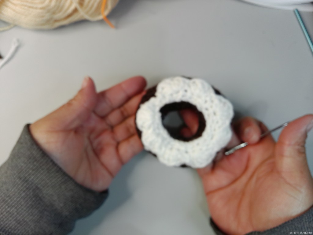 You should have 8 shells total. Sew the icing to the top of the donut base. Add sprinkles (optional) by sewing them on top of the icing with a contrasting yarn color!