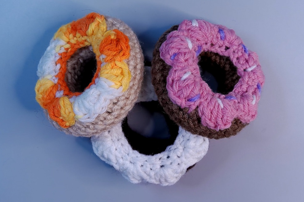 - 100% acrylic worsted weight yarn, weight 4 β two colors (donut base + icing)