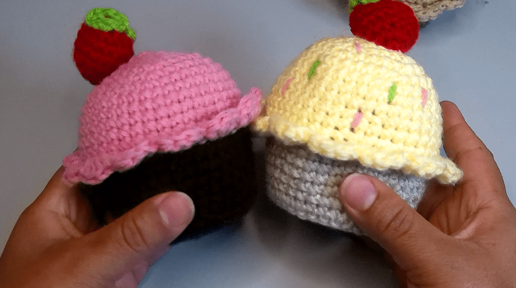 This cupcake is worked in two separate pieces β the cake bottom and the icing top β then sewn together. The ruffled icing edge is created in the final round using a cluster stitch worked in the front loops, which gives it that beautiful frosting swirl look. You can finish it with a strawberry topper, embroidered sprinkles, or even a little embroidered face. Have fun making it your own! π